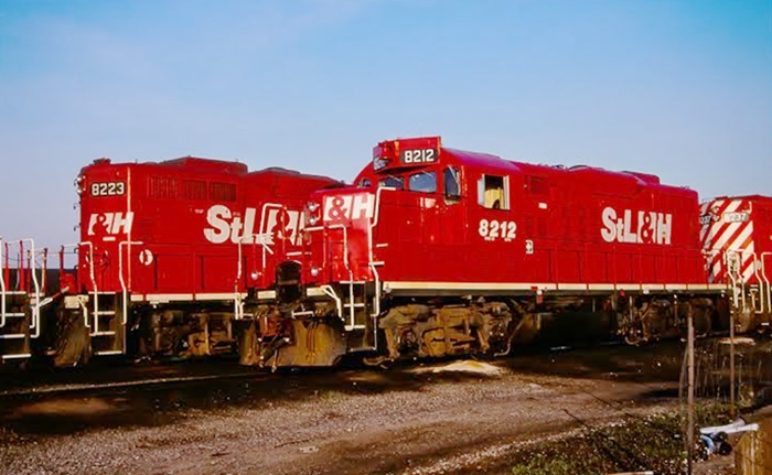 Two fully painted StL&H GP9u 8223 and 8212 posed side by side at Smiths Falls, I don't have the exact date...