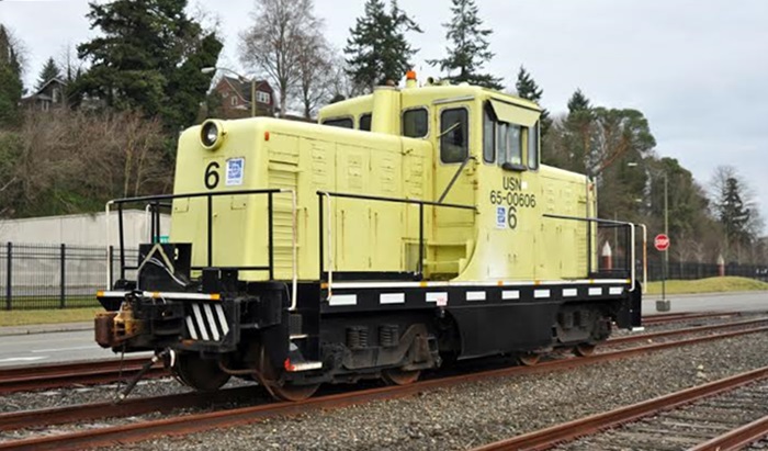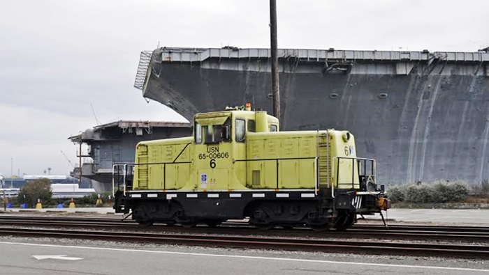 I drove by the Puget Sound Naval Shipyard in Bremerton, WA yesterday and saw a GE center cab locomotive parked in the receiving yard. Since I did not have my camera with me, I logged the scene in my mind. This morning we had to drive to Bremerton again. Only this time I remembered to take my camera with me. The entire shipyard must have been closed down to allow the workers to watch the Super Bowl as there were no cars at all in the parking lot. So I parked wherever I wanted to and photographed the switch engine. According to one of my old roster books, this is a 65 Ton GE built between 1941 and 1943. It is not a Tier 4 unit, but someone may like to see it. The aircraft carriers in the background are the Independence and the Kitty Hawk. Both are in the mothball fleet.
