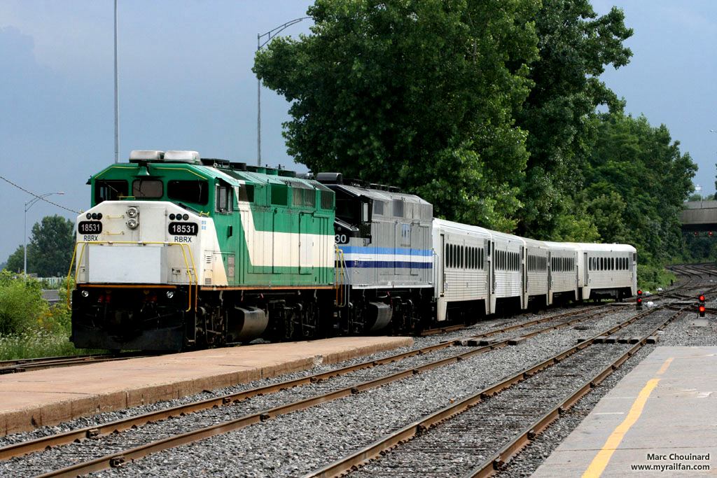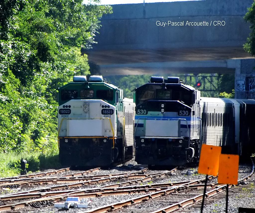Guy-Pascal Arcouette August 21st photo shows a comparison of the ex-GO Transit F59PH's in RBRX patch and AMT livery side by side.