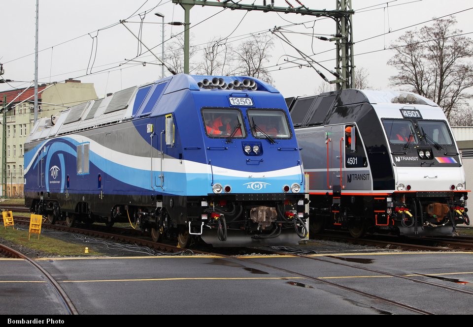 AMT From the Bombardier website, here are pictures of two of the first three ALP45DP pre-production units (AMT 1350 and NJT 4501). Reports indicate that at least one NJT ALP45DP is on American soil and is making its way to TTCI at Pueblo, for testing (cannot confirm if it is NJT 4500 or 4501).