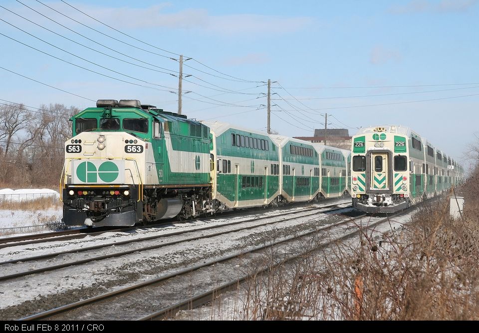 GO news editor Daniel Dell’Unto: GO 563, one of the few F59's still in revenue service, leads GO train 915 westward through Oakville Ontario, after meeting eastbound GO 918. GO Locomotives are always positioned on the east end of trains, with a cab car leading westward. However, GO 563 is leading Cabcar 215, with MP40 607 shoving on the rear. (Rob Eull).