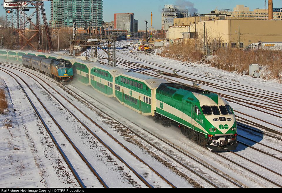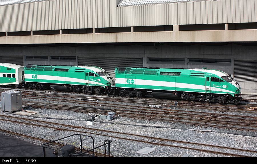 http://www.railpictures.net/viewphoto.php?id=356531&nseq=116 GO MP40PH-3C’s 654, 655 and 656 were noted at CN's MacMillan diesel shop in late-February awaiting delivery to GO (moving under MPEX reporting marks). They were delivered on March 2nd to Mimico. In mid-March, the last three MP40's entered daily service paired on trains as: 654/630, 655/607, 656/653. New locomotives typically run with an older unit as back-up during their first weeks of in service reliability evaluation. GO F59PH 559 was also noted in service in mid-March with another F59PH unit. 559 is the first overhauled unit of roughly half a dozen GO F59's that will be kept in service. Others in the 541-557 series have been noted parked out of service, with GO numbers and markings removed, presumably for resale. However several "newer" units like 559, 563 and 564 have been noted out and about in service. On March 18th, Daniel Dell’Unto caught GO Lakeshore West 917 departing Toronto Union Station in the afternoon. Brand new GO MP40PH-3C 654 is shown being broken in with older unit 630, both pushing westbound.