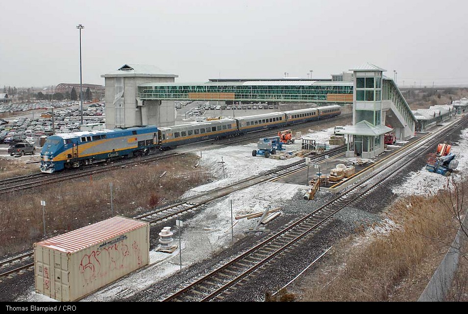 GO Transit announced it will spend $125 million to purchase 50 bi-level coaches from Bombardier for its inter-regional commuter service into Toronto. A total of 162 commuter coaches will expand the system's capacity by 8,000 commuters a day. Production of the coaches is scheduled to begin in June at Bombardier's facility in Thunder Bay, Ont., with deliveries beginning in the fall. The Bombardier-designed double-decker coaches have been part of GO Transit's fleet since 1978. Bombardier ‘s builds the most popular multi-level commuter rail car in North America - in use in 13 major cities, including Montreal, Vancouver, Los Angeles and Dallas. The order will include the 1,000th car manufactured in Thunder Bay. Bombardier's Thunder Bay plant is also building new subway and light rail cars for the Toronto Transit Commission and Metrolinx, the provincial government agency that runs GO Transit and [coordinates with other GTA agencies]. http://tinyurl.com/4jf3onk The new footbridge being built at the Whitby GO Station has been underway for about a year and is scheduled to be completed in a few months. The bridge will give passengers a second route from the platform to the south parking lot. Thomas Blampied submitted this photo of VIA 907 with Train 44 on March 23rd speeding through a light snow shower.