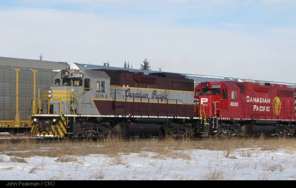 On March 3rd John Peakman caught CPR Script painted GP38-2 3084 arriving at Keith Yard in Calgary,AB. Behind was GP38-2’s 3020 and 3050 in Golden Beaver and and CP Rail small multimark.