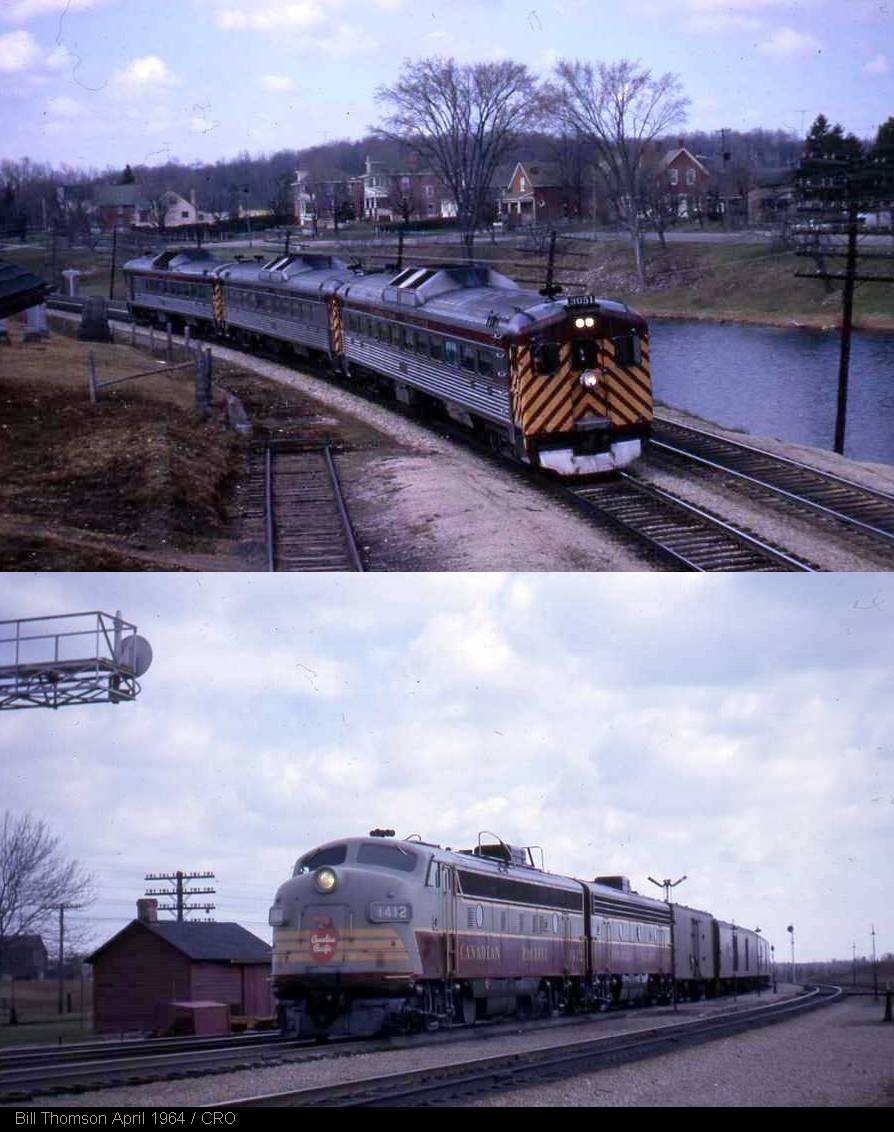 In the 1960’s passenger service was on the decline and beginning to prove very costly and CPR began to cut back on their train service. Bill Thomson recorded these last CPR trains in April 1964 on the Galt Sub. The final Train #360 had CPR 9051 leading the RDC trio at Campbellville, and the last Train #21 with “head-end” Express cars behind the A and B is making the station stop at Guelph Junction.