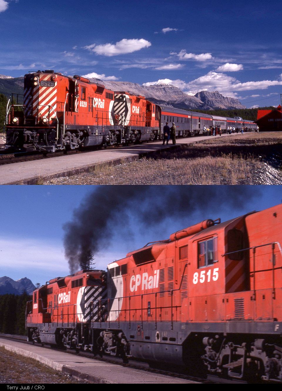 Terry Juuti submitted this photo of Train # 1 “the Canadian” with a pair of CP Rail Gp9's at Lake Louise, Alberta in the summer of 1977. CP had Geeps outfitted with steam generators for passenger service and although CP primarily used their F units, during times when an F was unavailable due to maintaince, the Geeps were the head end power on occasion. These particular units were notorious for making a lot of Smoke when they throttled out of the station as can be seen here.
