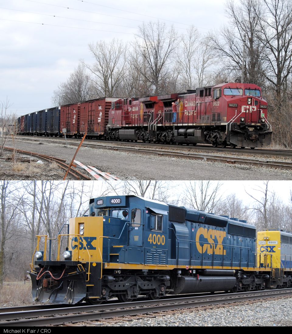 Michael K. Fair submitted this shot of CP 9622 and CP 9704 about to lead CSX train Q231-11 in Lima, Ohio on the CSX Toledo Subdivision on March 11th. One of the new CSX crew is checking water in the prime mover and going through the safety checklist, regulatory on CSX after a crew change. He also caught CSX SD40-3 4000 (a rebuilt SD40-2 with modified nose and cab), leading CSX Q375 on March 10th.