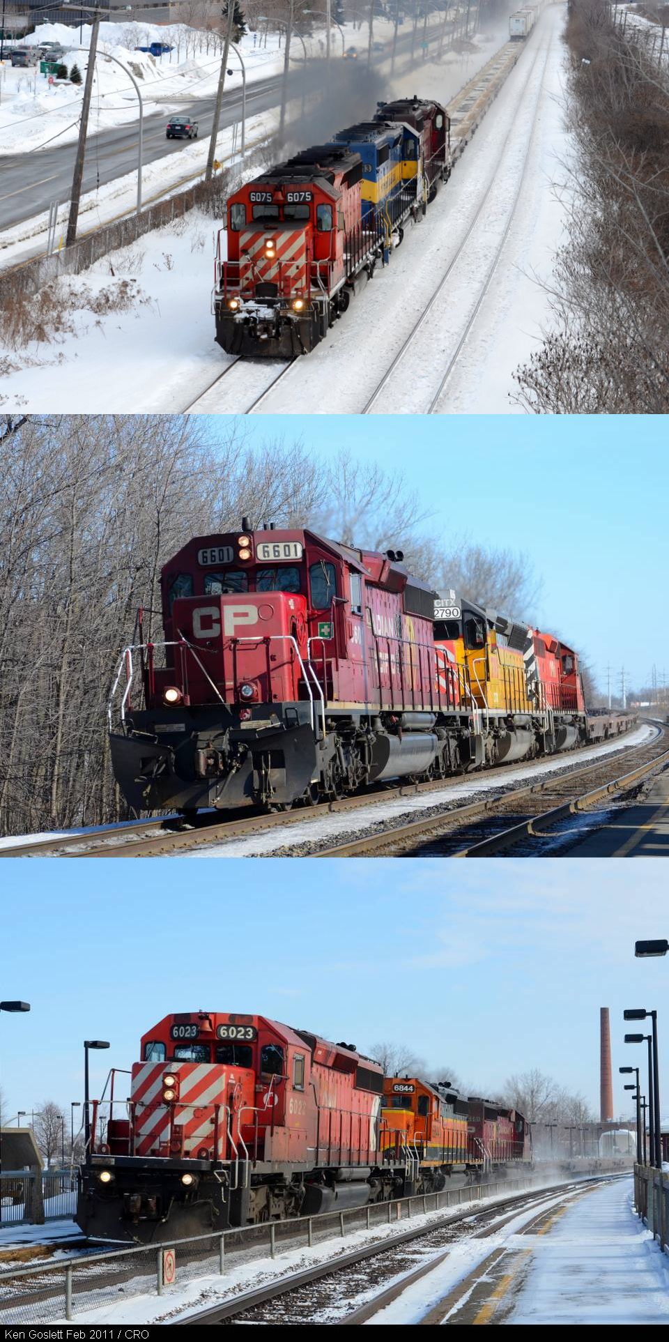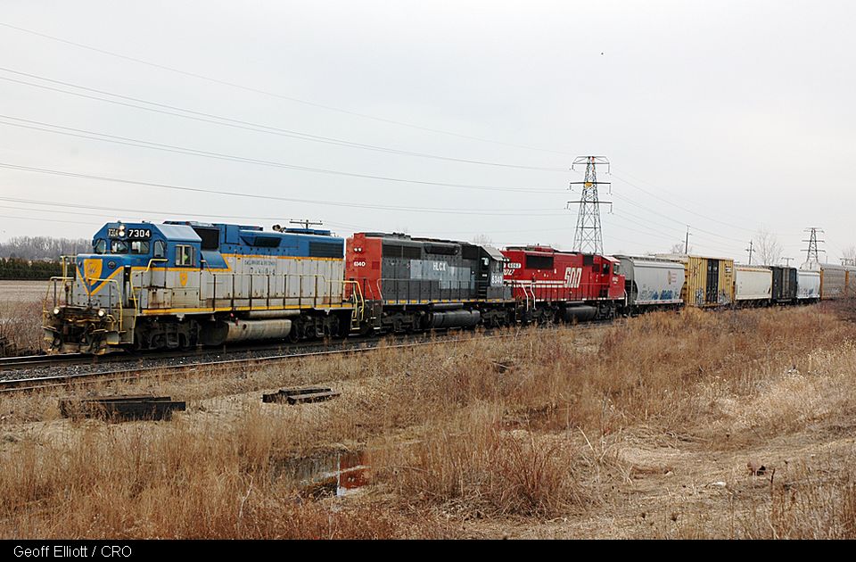 Ken Goslett caught this notable power on CP’s Xpressway trains: During February, DM&E SD40-2 6413 ran back and forth on the Montreal –Toronto run for a full week, and Ken caught her approaching Cedar Park, QC on Feb 13th. Leased CITX SD40-2 2790 (an ex-SD45) was clicked at Brucy, QC on Feb 20th and HLCX SD40-2 (ex-BNSF) 6844 was shot at Ste-Anne-de-Bellevue, QC on Feb 27th.