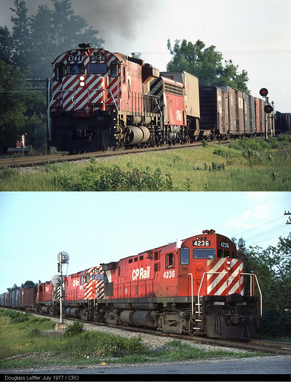 Doug Leffler photographed this meet at Kent Bridge, Ontario in July, 1977. The westbound, headed by 4236 stopped short of the siding at Kent Bridge Road to wait for an eastbound out of Windsor. The set of C424's on the westbound, while being a welcome set of engines for myself and the other photographers that day, was overshadowed by the surprising lead engine on the eastbound; CP Rail’s unique M640 no. 4744!