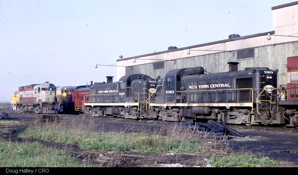What a day to be at the St-Luc Diesel Shop during 1966! Doug Hately clicked these unusual bed fellows sitting on the ready tracks: NYC Alco RS3 5303 and 5332, two UP Alco C630’s demonstrating on CP with Dynamometer car 62, and C424 4210 alone showing the home road colours!