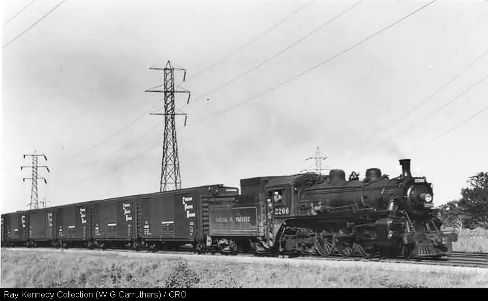 CPR Extra 2206 West is seen just west of Leaside with Automobile box cars (CP 294893 next to engine). These are 40 foot cars with 15 foot double doors. Hundreds were built in 1957 and those with white stripe on door indicates equipped with Evans Auto Loader device which raised an automobile up towards the roof in each end of car to doubledeck them. This is likely the Trenton Pickup returning home. 2206 was the regular engine on this assignment with engineer Alf Moore. Taken August 22, 1957 W. G. Carruthers photo from the collection of Ray L. Kennedy.