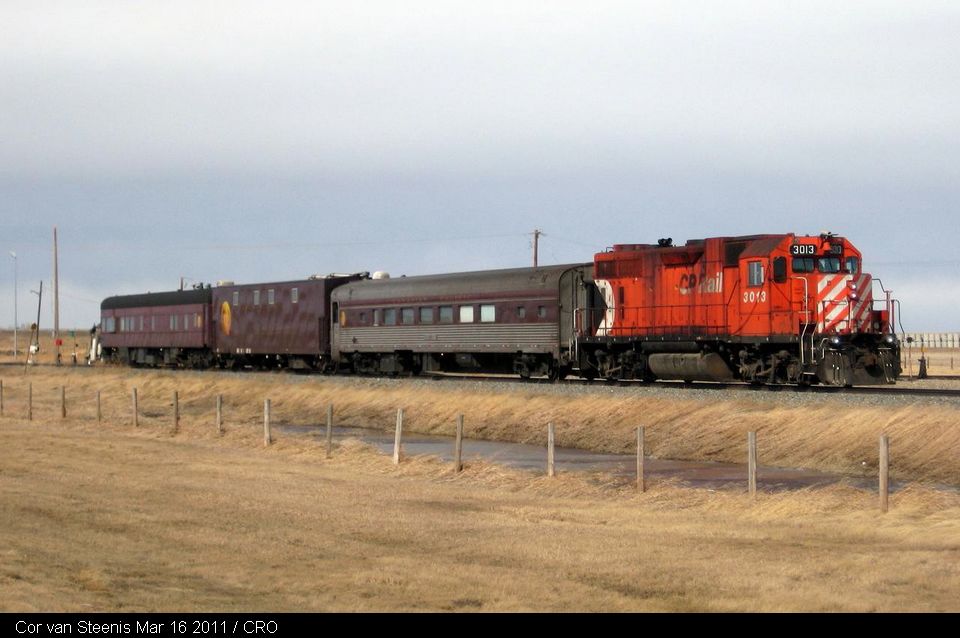CP GP38AC # 3013 leads Technical Evaluation Consist # 63 (Accommodation Car 65, Guage Restraint Measurement Car # 424993, Track Evaluation Car # 63) eastbound on the Taber Sub, AB, at the Junction with the Turin Spur on 16 Mar 2011. What is different about this consist? The stainless steel Accommodation Car # 65 is normally on CP's other TEC Train (#64); the tuscan coloured Accommodation Car # 68 is usually on the train shown.