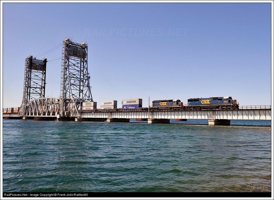 Bound for Montreal, CSX SD50`s 8634 - 8198 lead train CN326/CSXQ621 across the Beauhanois Canal (St. Lawrence Seaway) at Valleyfield, QC on April 13th, 2010 (Frank Jolin).