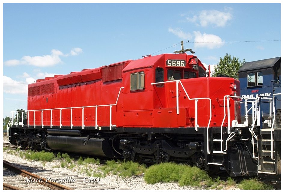The first week of July, Mark Forseille clicked former CP SD40-2 5696, now (J&L Consulting) JLCX 5696 in New Westminster, BC. Repainted in a SOO-like red with white handrails, she will be lettered JLCX 5696. As well, ex-CP GP9u 1689 is now Black River 1889, and was inside the SRY shop in mid-July