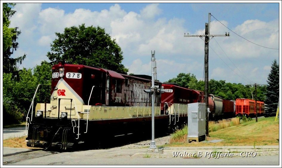 ONTARIO:Walter caught OSR 378 and 383, a pair of ex SOO GP7’s switching out some hopper cars in Beachville Ont on a hot 38C day, July 21, 2011