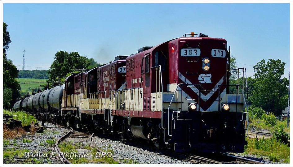 On July 15th OSRX GP7 383, 378 and 182 RS18u arrive in Woodstock Ontario with their version of an ethanol train, 20 tank cars from Tillsonburg.