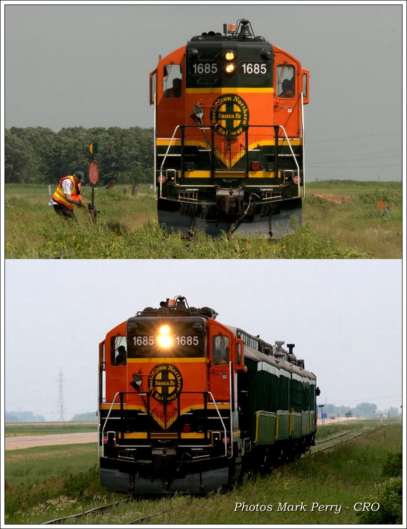 Mark Perry submitted these shots of former BNSF GP9 1685 on the Prairie Dog Central on June 29th and 30th working freight cars between Lilyfield (Outskirts of Winnipeg) and Grosse Isle, Manitoba. The historic Canadian-built GP9 was donated by BNSF last year.
