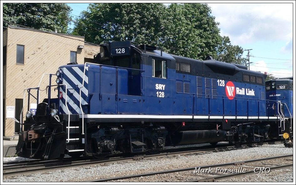 The newest arrival and wearing fresh paint in July, SRY GP9u 128, (Former CP 1583) is seen working the yard in New Westminster, BC paired with SRY 122.