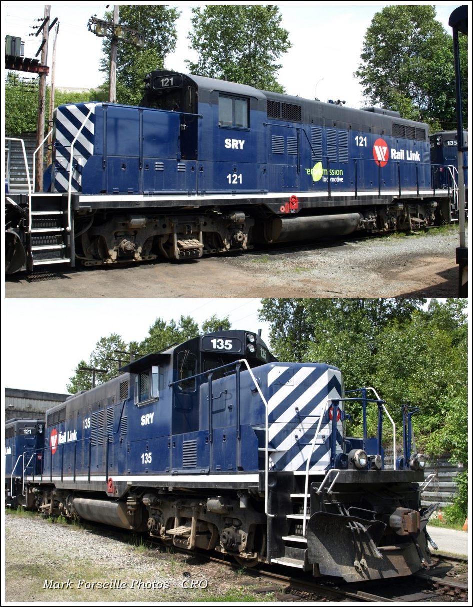 Mark Forseille submitted these fine shots of Southern Railway of British Columbia (Railink) GP9`s photographed in New Westminster, BC June 12th. Mother unit SRY 135 is paired with the cab control unit (Slug) SRY 121.