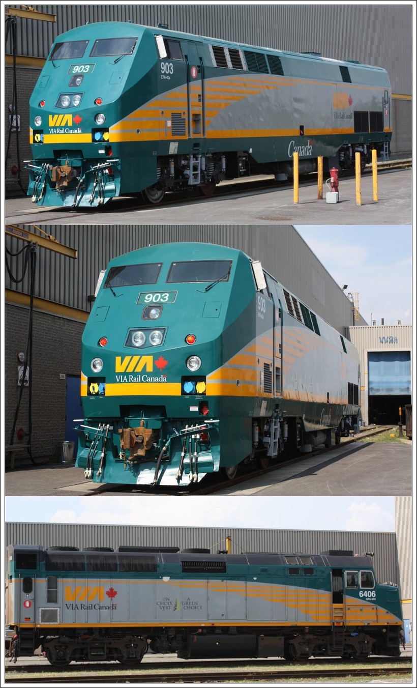 Collision damaged VIA P42DC 903 has been repaired and repainted into Renaissance green livery and photographed at VIA MMC July 3rd along with VIA F40PH-3 6406, about to enter the Maintenance Shop for inspection.