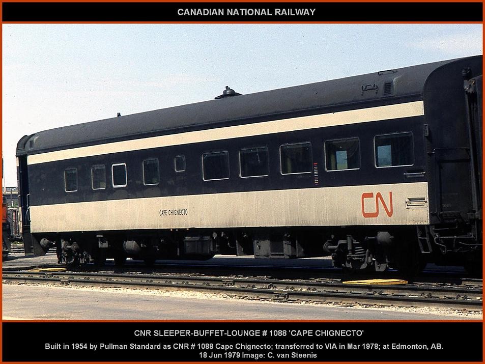 CNR Sleeper-Buffet-Lounge Car 'CAPE CHIGNECTO' was one of eight Cape-series cars built in May 1954 by Pullman Standard. This car was built as CNR #1088 “Cape Chignecto”, a 2-compartment, 2-Double Bedroom, Buffet, Lounge Car; the second car to carry that name; it was painted in the olive green and black livery with yellow lettering. It was in service on CNR passenger trains until transferred to VIA Rail in March of 1978. Cor van Stennis photo shows the car in Edmonton, AB., in June 1979 in the VIA fleet, but still in CN livery. In 1986 it was sold back to CN, and became CN #15165 'TAWAW'. it was later re-numbered to CN #1059 “TAWAW” and is used today as a Reception-Marketing Car on CN Executive Trains. After being re-acquired by CN in 1986 it was re-painted into the 1954 era olive green and black livery with yellow lettering (until 2004) and since then has carried the current red and cream business train scheme.