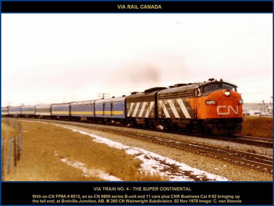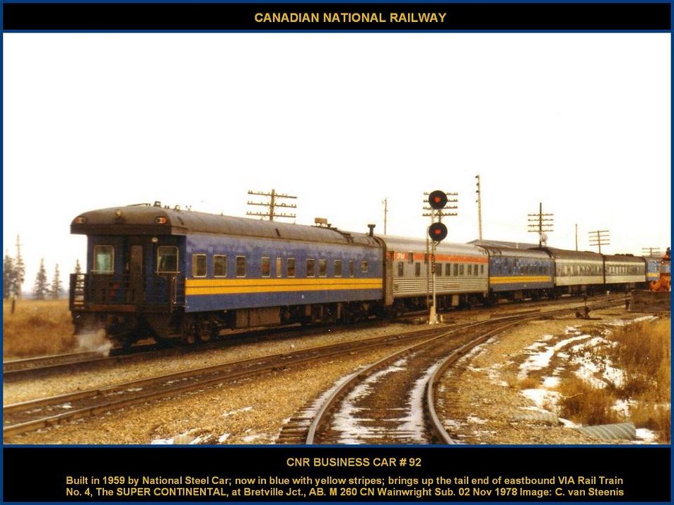 The link below shows the car as it appears today: http://www.rrpicturearchives.net/rsPicture.aspx?id=261953 The shell of CNR Business Car #92 was built in 1959 by National Steel Car, and the interior completed by Point St. Charles Shops and painted in the olive green and black scheme with yellow lettering adopted for the 1954 Super Continental. In 1978 it was painted in the blue and yellow VIA scheme although it remained a CNR Business Car and was never transferred to VIA. It is seen here in the blue with yellow stripes bringing up the tail end of VIA Rail Train No. 4, The SUPER CONTINENTAL, behind ex-CN FP9A # 6513, a B-Unit and 10 cars at Bretville Jct., AB., M 260 CN Wainwright Subdivision on 02 Nov 1978. At this date it was assigned to the CNR Vice-President Prairie Region and was based in Winnipeg, as it was throughout its service with CNR. The car was sold in 1994 and is now named SCOTTISH THISTLE (PPCX 800636), based in California for private excursion service at the tail end of Amtrak trains. It is painted in the CNR olive green and black colour scheme of 1954 but without the CNR heralds.