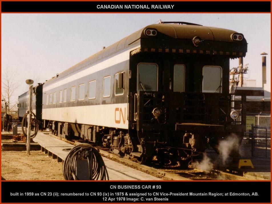 The link below shows the car as it is today: http://www.rrpicturearchives.net/rsPicture.aspx?id=60312 The cars shell of CNR Business Car #23 was built in 1959 by National Steel Car as CNR Business Car # 23 and the interior completed by Point St. Charles Shops in 1960; it was the second CNR Business Car to carry the number 22 and was painted in the olive green and black scheme with yellow lettering adopted for the 1954 Super Continental. In October of 1975 it was re-numbered to CNR Business Car # 93, the ninth car to carry that number. In the first image we see the car at its home base adjacent to the downtown Edmonton station on 12 Apr 1978 painted in the 1961 gray and black scheme with the red CN 'wet noodle'. Later in 1978 it was painted in the blue and yellow VIA scheme although it remained a CNR Business Car and was never transferred to VIA. It is seen in the second image in the blue with yellow stripes being turned on the wye at Jasper, AB., on 18 Aug 1989. At this date it was assigned to the CNR Vice-President Mountain Region and was based in Edmonton, as it was throughout its service with CNR. The car was sold in 1992 to a private owner, restored, and is now named TIOGA PASS (PPCX 800693), based in California for private excursion service at the tail end of Amtrak trains; it is still painted in the blue and yellow scheme.