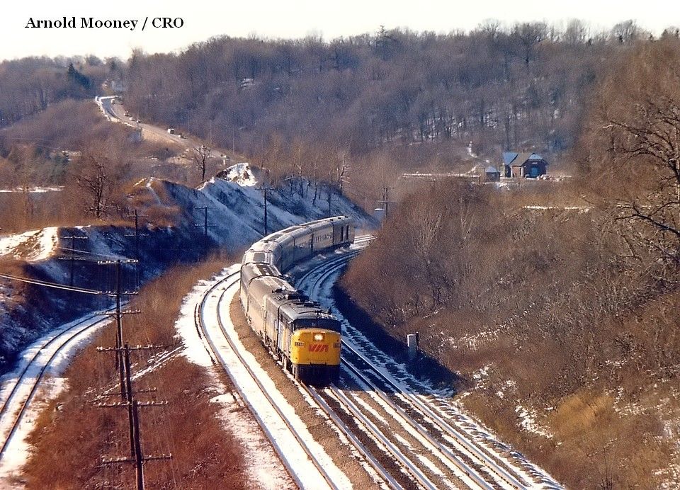 Arnold Mooney took this great shot at Dundas, Ontario on December 5th, 1979. The low mid-day sun is very evident as it casts a long shadow over leader VIA FPA4 6786 moving eastbound toward the next stop at Aldershot. Those in the know will observe there is very little seen in this photo that is still evident today, outside of Hwy 8 climbing the hill at left and of course the CN Dundas Sub mainline. The power is now gone, the station was damaged by fire and subsequently torn down after an attempted deal to sell it to Dundas fell through, the shed opposite is gone, and the track at the lower left was removed (it serviced the quarry facility), all during the mid to late 1980s. The siding to the left of the main is now gone and perhaps even the pole line too. As well, this vantage point is also gone. The landscape is basically unchanged, now part of a preserved area used by hikers on the trails to Dundas Peak and the waterfalls.