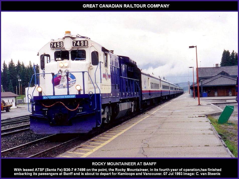 ROCKY MOUNTAINEER VIGNETTE: With leased Santa Fe B36-7 #7498 on the point, the Rocky Mountaineer (during its fourth year of operation), is seen at Banff, Alberta about to depart for Kamloops and Vancouver, British Columbia on July 7th, 1993.