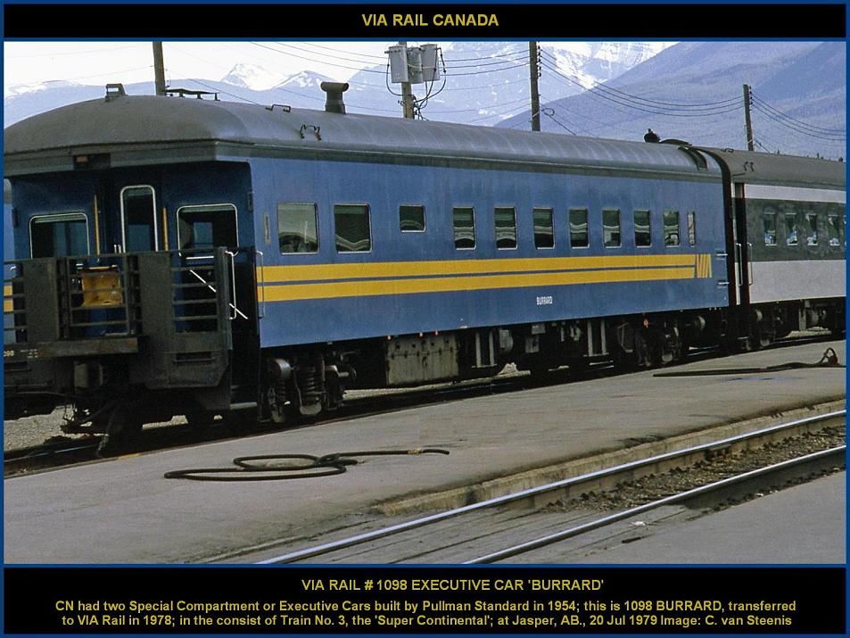 CN had two special compartment or Executive Cars built by Pullman Standard in May 1954; 1098 BURRARD and 1099 BEDFORD. Th ephoto shows 1098 BURRARD, a 7 Compartment - Buffet - Observation - Lounge Car; seen here while on the VIA Rail roster in the consist of Train No. 3, the 'Super Continental'; at Jasper, AB., 20 Jul 1979. The two cars were built primarily for CNR charter service but were used in public 'Executive Club' operation on the Montreal-Toronto 'Rapido' trains until 1968. In 1958 it was in the 11 car consist of the Royal Train carrying Princess Margaret from Malton Airport to Halifax on the eastern Canada portion of her Official Visit. In 1959 it was the car immediately adjacent to Government of Canada Official Cars 1 and 2 on the rear of the 16 car Royal Train carrying Queen Elizabeth and Prince Philip to the opening of the St. Lawrence Seaway. It was in the consist of a special train to inaugurate the VIA Rail blue with yellow stripe paint scheme before the car became VIA property in Mar of 1978. The car was retired by VIA in Dec 1982 and sold to a private buyer in California in 1992; it is still in operation there as a private car named BURRARD (PPCX 800591); in 2007 it was re-painted in CNR's 1954 olive green and black scheme, with the CNR maple leaf heralds on the sides and 'Canadian National' on the letterboard.