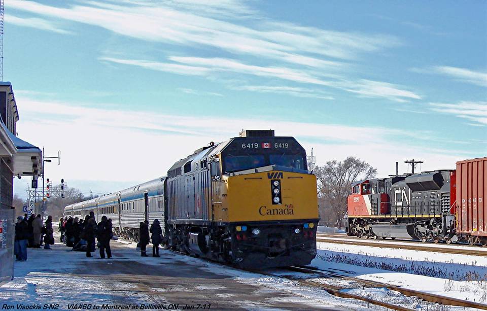 On January 7th Ron Visockis shot VIA F40PH-2 6441 leading train #57 and VIA 6419 with train #60 at the station in Belleville, ON. Over the Christmas season, these trains had routinely been under the command of a P42, due to their extra length. Now that the consists have shortened back down, they have once again been turned over to the hands of a single F40.