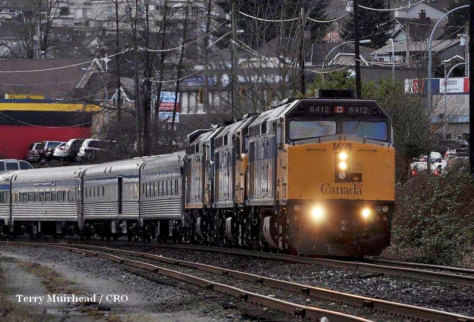 On January 17th a late VIA #1 lead by VIA 6412, 6440, and rebuilt 6433 are shown passing by Spruce Control in New Westminster BC after striking a large boulder at Mile 29 on the CN Yale Sub earlier that morning just West of Yale BC. (“Spruce Control” is the CTC Control point for the Station name Mile 144.5 CN Yale Sub). VIA 8710 “Prince Albert Park” brings up the rear on #1 as it backs into Pacific Central Station at Burrard Inlet Jct. VIA 6412, 6440, & Rebuilt 6433 (ex-Spiderman 2 wrap) are seen later on Track 5 at Pacific Central Station as VMC employees examine plow damage to 6412. F40PH-2’s 6412 and 6440 were taken inside the VMC shop leaving rebuilt 6433 with the remaining consist, and 1 deadhead coach. (Terry Muirhead)