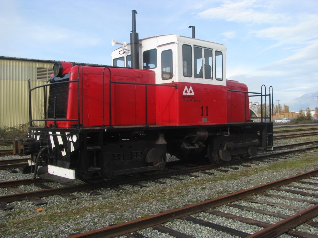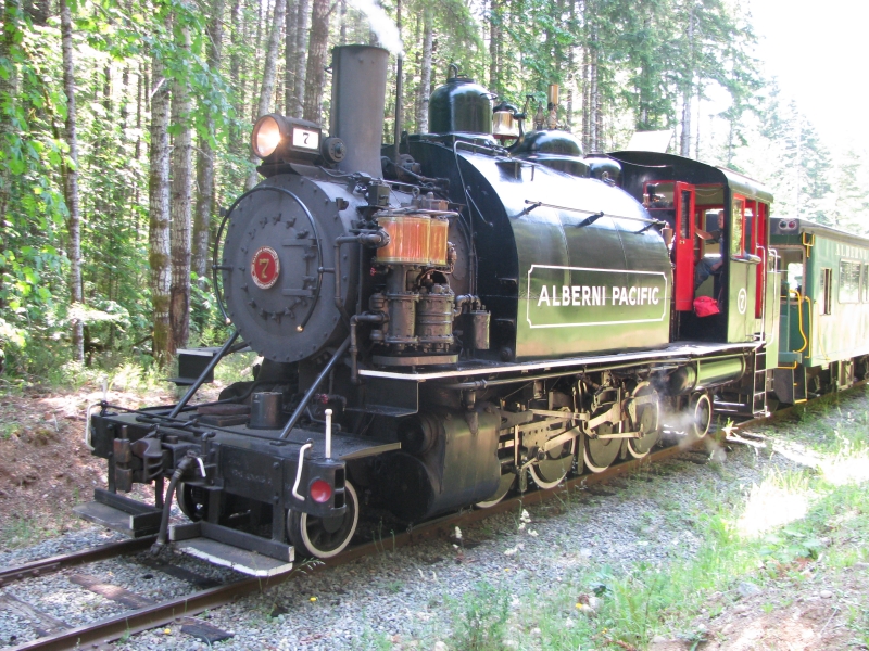 I have attached 2 photos, one of the #7 steam engine with passenger coaches heading up the 3% grade to the McLean Mill National Historic site. The other is of the recently restored ex MacMillan Bloedel GE 44 Ton switcher #11. It was used this past weekend November 23 in the BC Institute of Technology's conductor training program. The student come to Port Alberni from Vancouver to get hands on experience with switching moves and road switching.