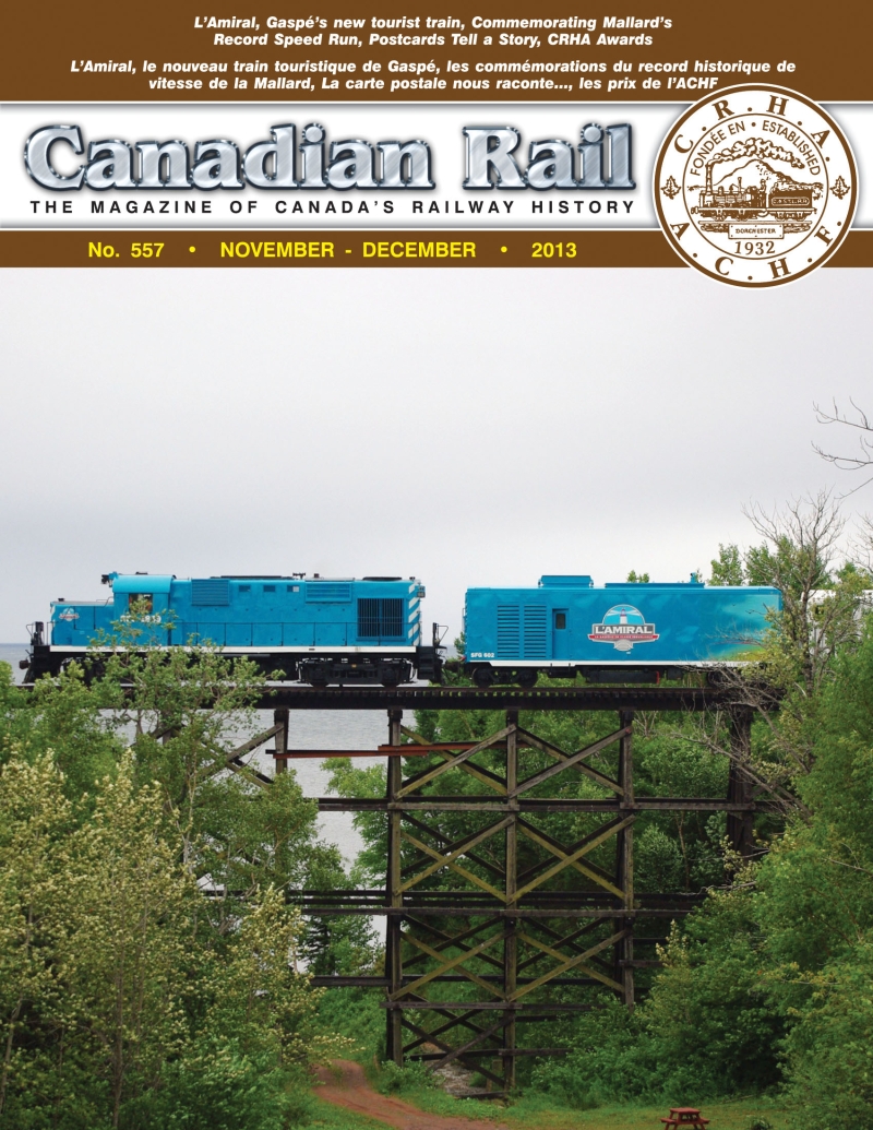 The November - December issue of Canadian Rail features an in-depth look at the new L'Aimral - Gaspe's new tourist train; A feature on the Dominion of Canada exhibition at York, UK; Postcards Tell a Story and a report on the 2012 CRHA Awards. Canadian Rail is mailed to members and is available at better hobby shops across Canada.