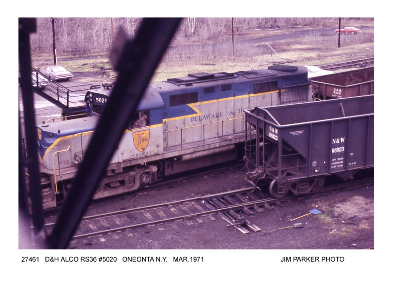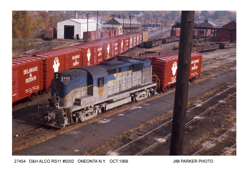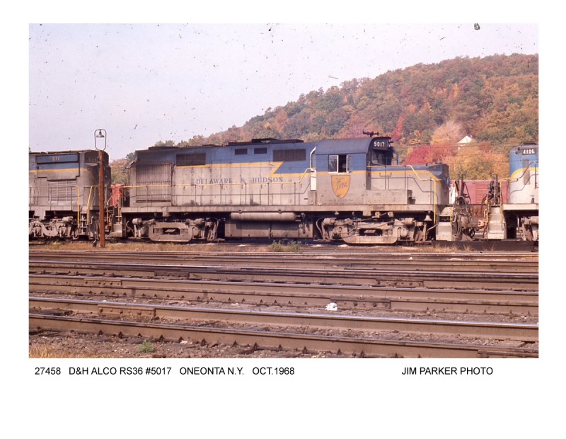 DELAWARE AND HUDSON VIGNETTE: In October 1968, Jim Parker snapped beautiful RS36 5017 at Oneonta, NY coupled between ALCO siblings a C628, and an RS3. This RS36 is still running today with same number on the Delaware and Ulster in the Empire State.