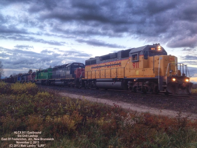On November 2nd, Matt Landry caught HLCX 911 leading a six-unit eastbound New Brunswick Southern freight, just east of Fredericton Jct, New Brunswick.