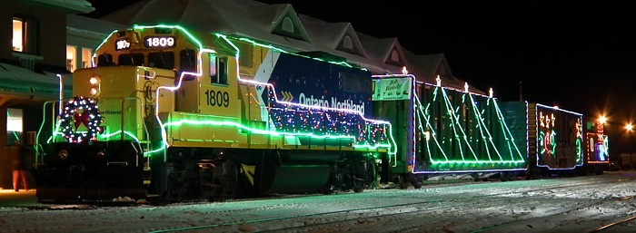 As Christmas caroling and visits with Santa are in full swing a couple of cars back, GP38-2 1809 with her new paint job and symphony of Christmas lights shines brightly on the main at Cochrane in December 2011. See the 2013 Christmas Train schedule at: