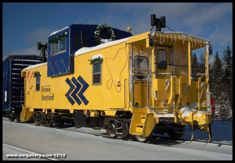 A view of the tail end of Ontario Northland's Christmas Train in daylight surroundings captured on Cochrane Shop's 4 track December 12, 2012. Pictured is van ONT 123 which is pulled from any sort of active service, repainted, and is used as part of a permanent "Christmas Train" configuration. The two other cars pulled from service and used exclusively for the train are a 4000 series i-beam and a 7000 series plug door box (Mike Robin)