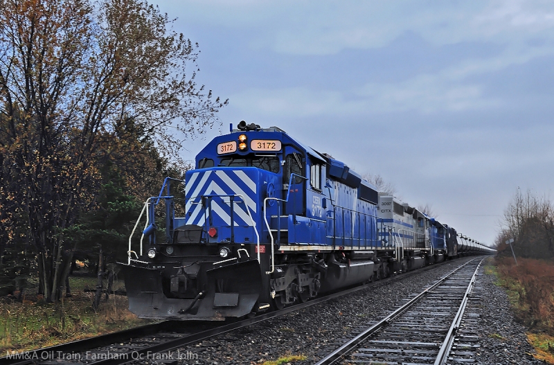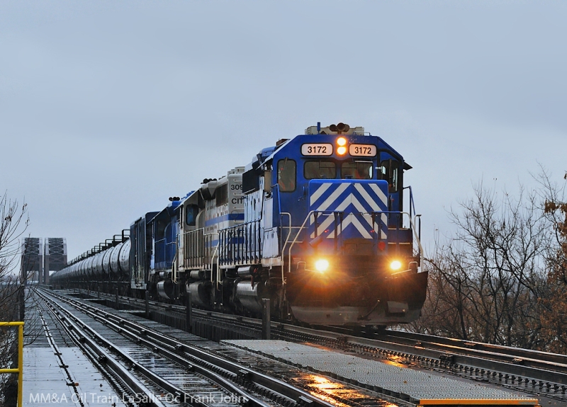 The MM&A crude oil train that had been stranded at Farnham, QC ever since the since the July 6th Lac-Mégantic tragedy, finally left for Montreal. The consist was then interchanged with CN on November 10th, and then was forwarded as CN U702 east to Saint John NB. Francois Jolin snapped the train ennrout6e at east of Farnam and on the CP bridge to Montreal at Lasalle, QC.
