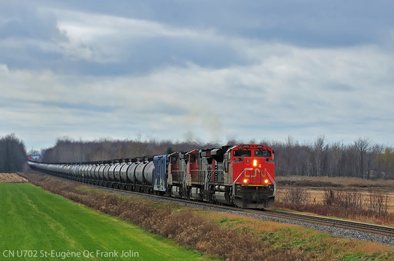 At St-Eugène, QC, The same MM&A train, now Canadian National oil train #U702 heads for Saint John NB with the rerouted MM&A consist that was stranded at Farnham, QC since July 6th in the aftermath of the Lac-Mégantic disaster. The locos are CN 8888, CN 2599 and CN 2631. (Framcois Jolin photo).