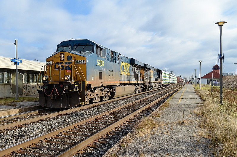 CSX power in Montreal.... CN 327 (and its eastbound counterpart, CN 326) almost always have pure CSX power as they run through to CSX and pick up a CSX crew in Huntingdon, QC. Here CSX 5208 (GE ES40DC) & CSX 908 (GE ES44AH) lead CN 327 westbound through Dorval. Photo taken Nov. 19th. (Photo by Michael Berry).