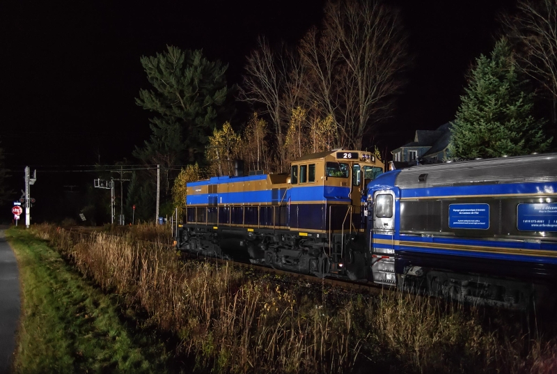 Coming past Gary Knap to a full atop the stepladder on the rear of the Orford Express is the only remaining example of an M42oTR (ex- Roberval-Saguenay) #26! The M40TR is a very unique looking engine. Originally built in Montreal by MLW for Roberval & Saguenay Railway in Northern Quebec, only two were constructed. I waited and shot the unit returning past this location leading eastbound but concluded this was a more attractive angle to share. A very attractive excursion train! Special thanks again to Frank Jolin! Shot at Foster, Quebec at 19:15 on October 25th.