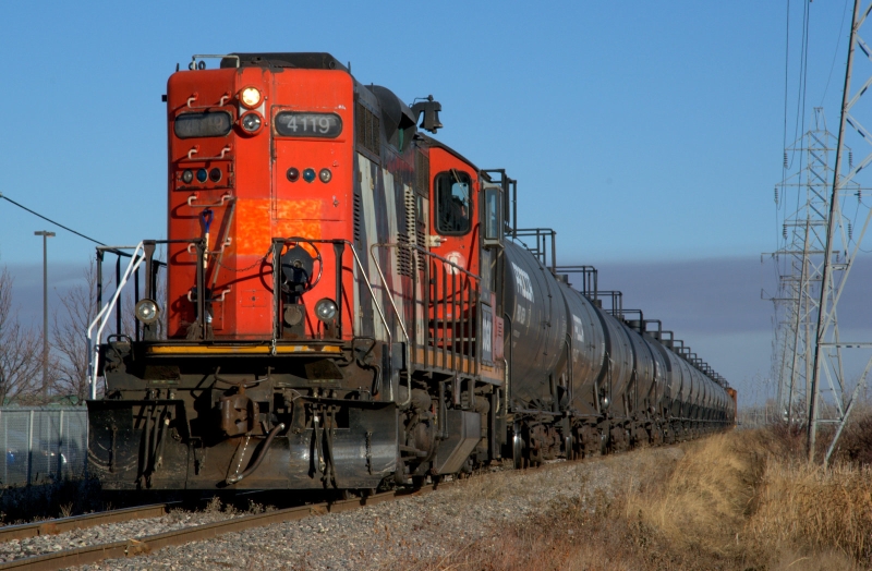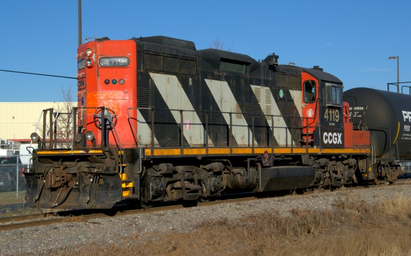 Mark A. Perry snapped CCGX GP9RM 4119 on a CEMR yard job, moving through the Winnipeg suburb of Transcona, MB on November 13th. It was transferring cars from the CEMR’s yard in North Transcona to CN’s Symington Yard.
