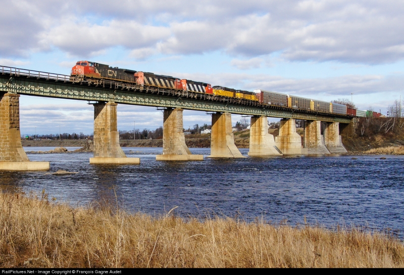 Enroute to the Saturday Locomotive Servicing (SLSX) are ex-ARNAUD RAILWAY RS18’s temporarily numbered MDXX 910 and 911. They will be repaired and prepared at the Saturday Locomotive Servicing shops for leasing to prairie regional shortlines and will retain their MDXX reporting marks for now. Iwo more. MDXX RS18 908 and 909 are being picked up by CN and forwarded as well from their barge service to Sept Iles, QC. . On November 9th, Francois Gagne Audet poised himself near the CN bridge on the shore of Rivière-Chaudière, and photographed CN 401 departing West Jct in Saint-Rédempteur, QC. His photo shows in the CN consist and dead in tow behind CN C44-8W 2579 are the two former Arnaud Railway RS18’s. bound for Saskatchewan.