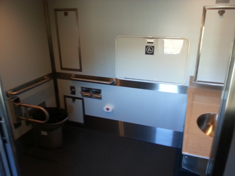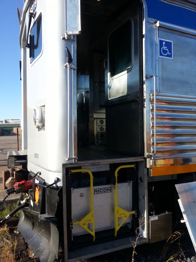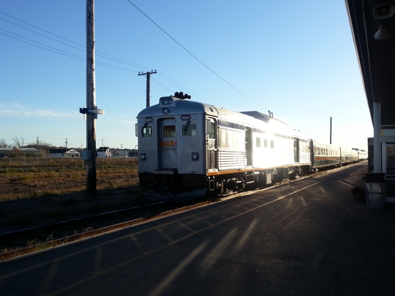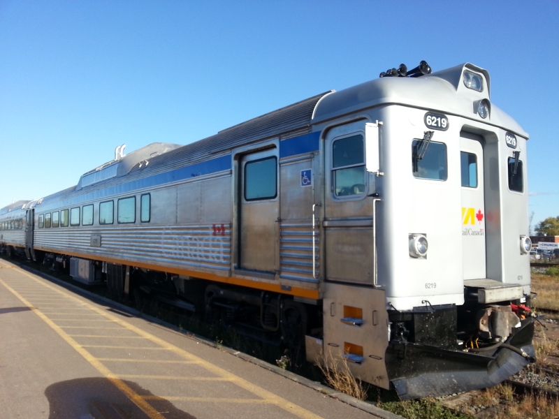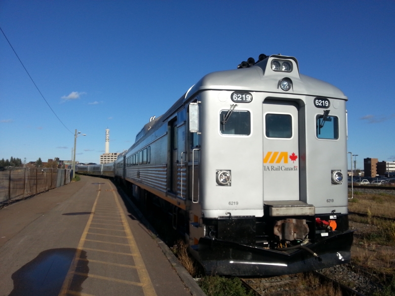 On October 29th, the last three RDCs being rebuilt for VIA by CAD at the former IRSI plant in Moncton NB were released along with three additional rebuilt LRC coaches. VIA 6219, 6208 and 6251 were rebuilt in like fashion to their sisters currently serving on the Sudbury-White River route, with extensive interior and exterior overhaul, one cab removed from each unit (so passengers do not exit through the operators cab), larger accessibly washrooms, new “third-eye” HID headlights, and a fresh paint scheme. In addition to the standard suite of modifications, 6219 and 6208 have also had new remote controlled wheelchair lifts added at the operators end (note the step covers). According to early reports, VIA is planning to send these units to test in service on the “Skeena” (Jasper-Prince Rupert), and it has been suggested that they may try to operate the units with a trailer car (such as a Panorama). Chris McMahon submitted these photos of the freshly shopped units ready to depart Moncton on the tail end of the Ocean, including a glimpse into the new interior.