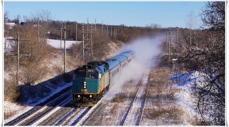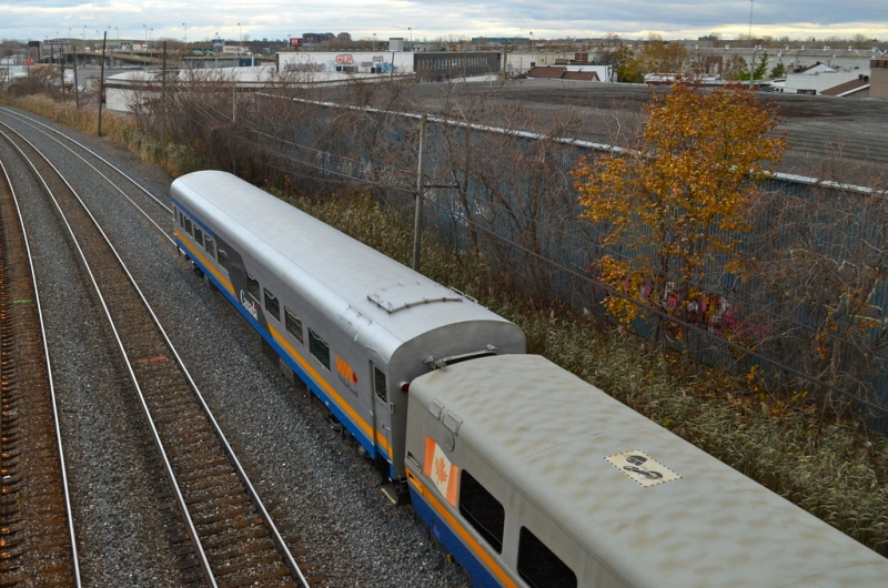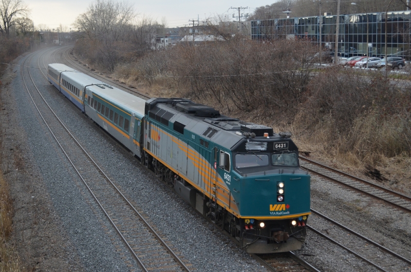 On November 14th, Michael also caught an unusual sight, with VIA 6431 missing a numberboard. Taking a page from the Red Green handbook, VIA has covered over the missing board with duct tape! Recently rebuilt LRC club car 3475 is also featured in the consist.