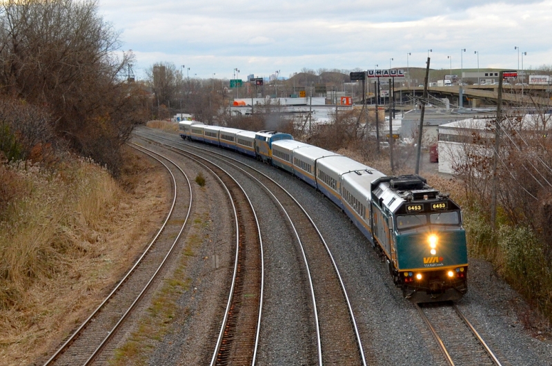 On November 7th, Michael Berry caught this fantastic VIA consist west of Montreal. Here we see VIA 59 operating as a J-train behind 6453, with 904 in the middle of 8 LRC cars, and lounge car Glen Fraser bringing up the rear.