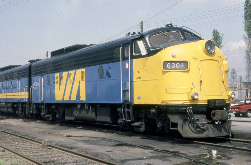 On May 27th, 1986 Bill Volkmer photographed immaculate VIA Fp9A 6304 and matching B-unit in Vancouver, BC. (from our friend Wayne Koch with thanks).