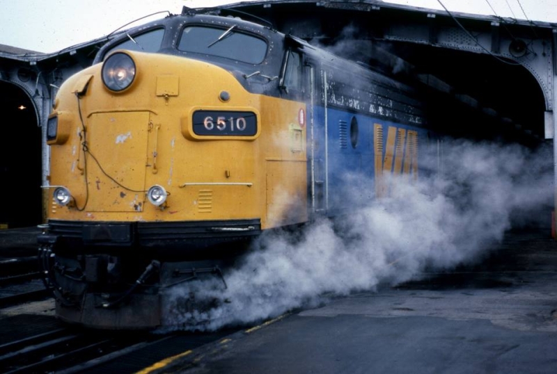 A scan from the Brian Schuff collection, VIA 6510 is seen under the train shed at the Station in Winnipeg surrounded by steam.