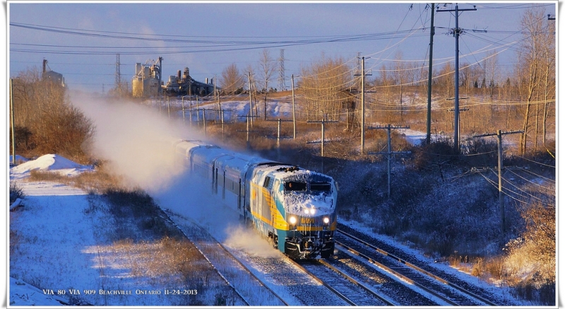 Winter is fast approaching, and the snow has already started falling on some parts of the VIA network. Frequent CRO contributor Walter Pfefferle captured the approach of winter fantastically in these stunning photos. In this sequence of photos taken November 24th, we see VIA 80, 71 and 72 at Beechville ON, kicking up the early snow (and taking some of it with them!).